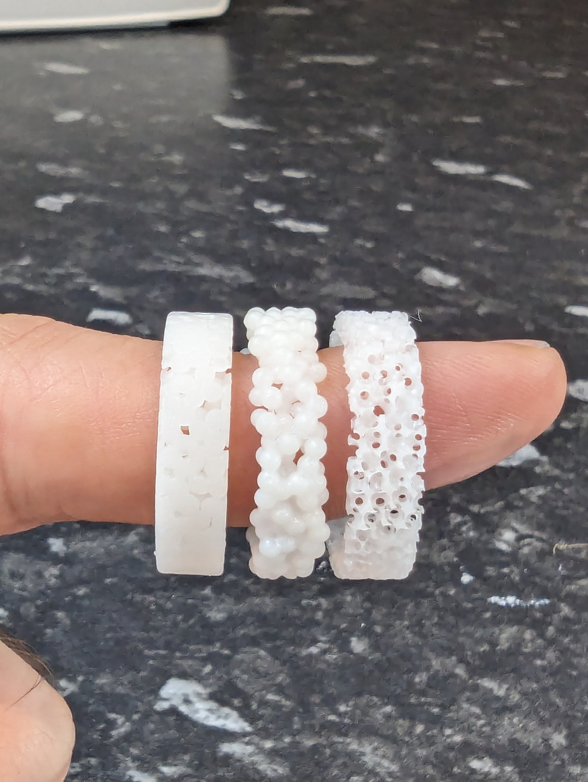 Three rings showing off different aspects of the packing of spheres. One ring (middle) shows the spheres themselves. Another ring (left) shows the intersection of these spheres with a band. The last ring (right) shows the empty spaces between the spheres and the band. We call this the pore space.